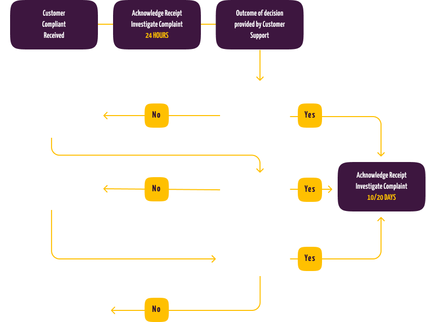 Customer Support will respond to your complaint as quickly as possible and will acknowledgement receipt of the complaint within 24 hours. The acknowledgement will also stipulate whether the information in the complaint is sufficient to fully investigate the issue.